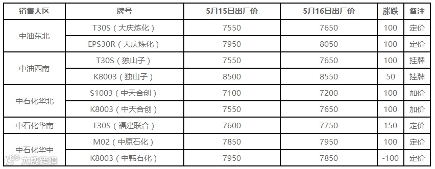 表5 5月16日国内PP出厂价格调整(单位:元/吨)