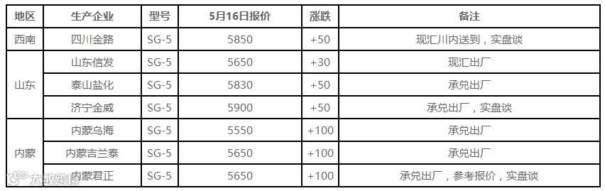 表6 5月16日国内PVC出厂价格调整(单位:元/吨)