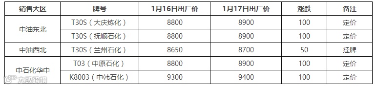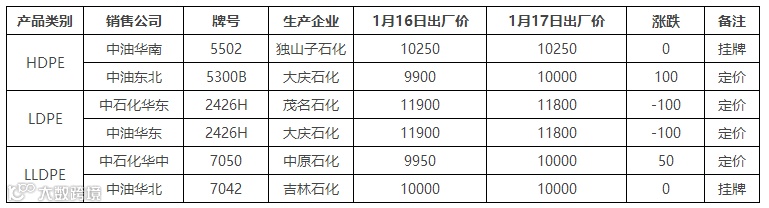 表4 1月17日国内PE出厂价格调整(单位:元/吨)