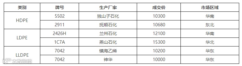 表1 1月17日我的塑料网PE市场成交价格(单位:元/吨)