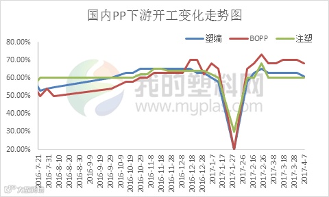 截止4月7日当周,国内聚丙烯下游行业开工率略有下降。其中塑编行业开工率在61%左右,共聚行业开工率在60%,BOPP行业开工率在68%左右。北方部分地区环保管控提升,部分下游工厂被迫关停。