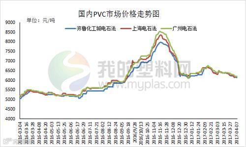 本周国内PVC市场价格弱势走低,电石料跌幅在80-150元/吨上下,乙烯法价格下跌100-150元/吨。清明小长假后首个交易日,V1705期货强势反弹,涨幅近2.37%,虽华东市场商家有拉涨意向,但现货市场供需失衡格局持续,市场推涨明显乏力。加之乙烯法企业下调出4月份出厂价,加剧市场看空氛围,隔日市场出货略显不畅,商家再次进入实盘按量定价模式。下游工厂多维持刚需小单采购,实盘成交一般。