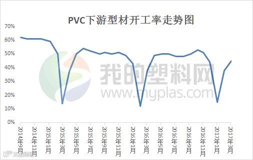 本周国内PVC下游制品开工变动不大,在44.6%。京津冀地区受重污染天气影响,多数制品企业开工降3成左右;河北雄安新区设立,该区域塑料制品企业后期将受到限制。