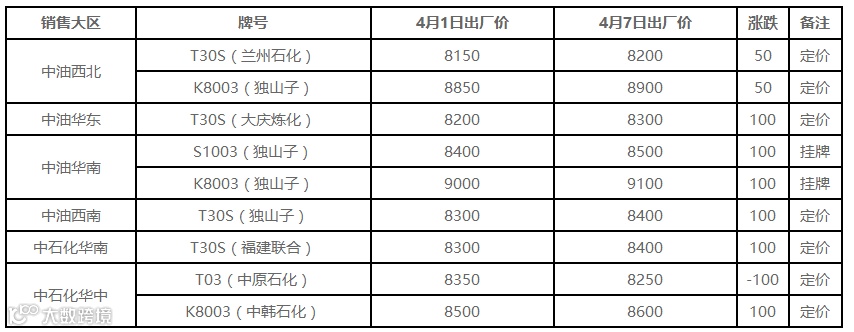 表2 本周国内PP出厂价格调整(单位:元/吨)