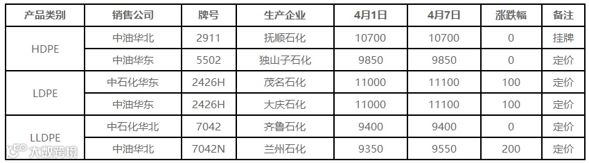 表1 本周国内PE出厂价格调整(单位:元/吨)