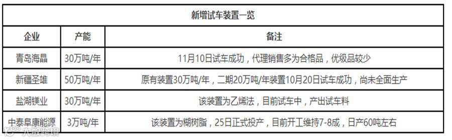 本周国内PVC企业暂无检修企业。河南神马开工恢复,其余企业装置均生产正常。近期青岛海晶30万吨/年乙烯法PVC装置试车;新疆圣雄二期20万吨/年PVC装置试车,但暂未生产正常;盐湖镁业30万吨/年乙烯法PVC装置试车;另外有中泰阜康能源3万吨/年糊树脂装置开工。11月底环保督察组进驻陕西,暂未对电石行业产生影响,后期关注该区域电石供应及到货情况。