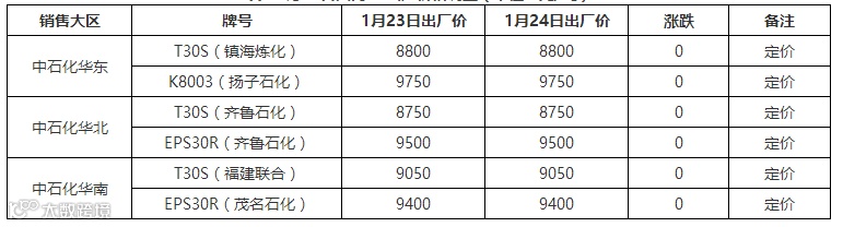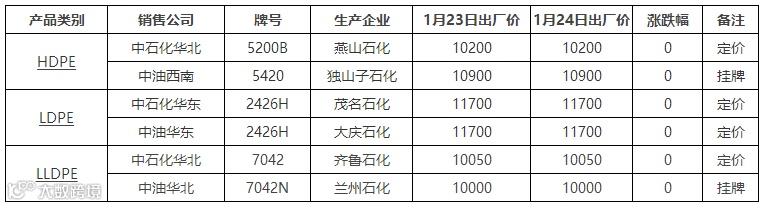 表4 1月24日国内PE出厂价格调整(单位:元/吨)
