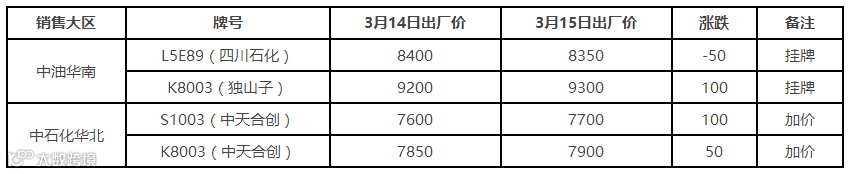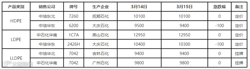 表4 3月15日国内PE出厂价格调整(单位:元/吨)