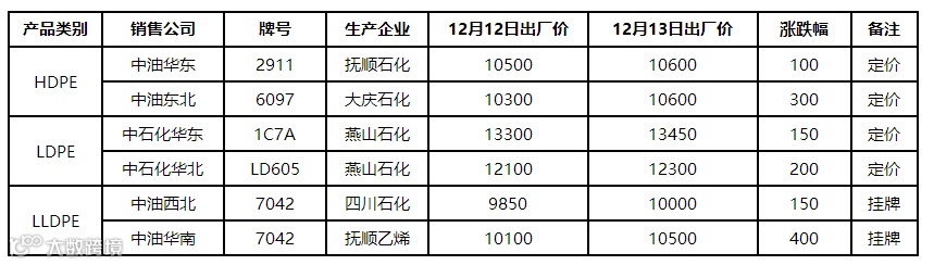 表4 12月13日国内PE出厂价格调整(单位:元/吨)