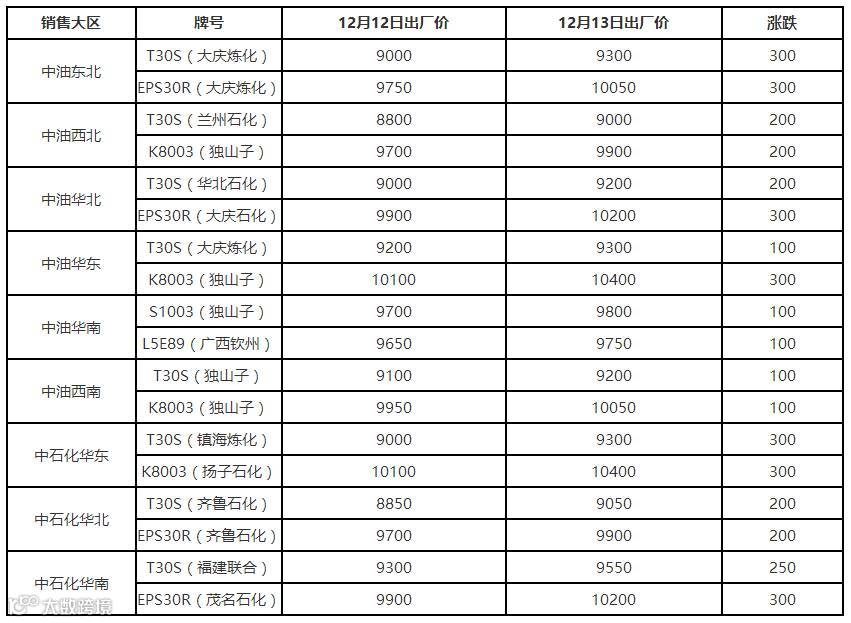 表5 12月13日国内PP出厂价格调整(单位:元/吨)