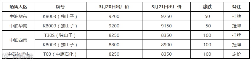 表5 3月21日国内PP出厂价格调整(单位:元/吨)