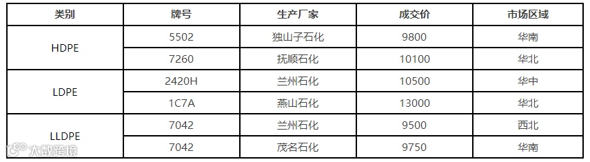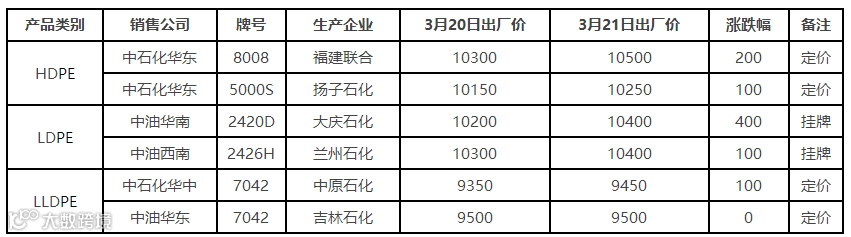 表4 3月21日国内PE出厂价格调整(单位:元/吨)