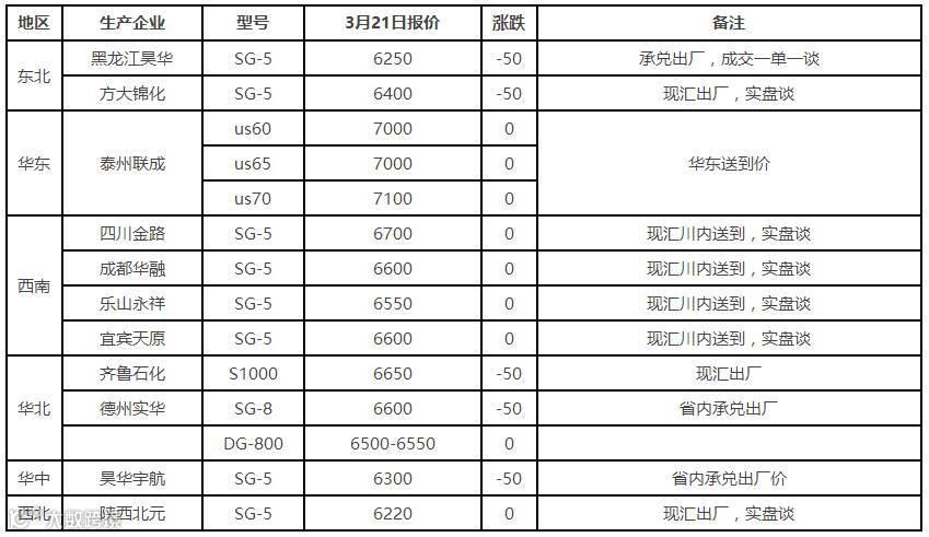 表6 3月21日国内PVC出厂价格调整(单位:元/吨)