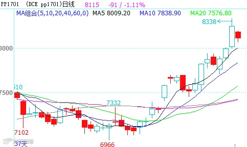 日K线图来看,MACD指标红柱呈现缓慢拉高,并呈现继续发散态势。均线系统来看呈现明显多头排列,5日均线附近支撑强劲。从整个图形来看,PP1701突破前期大的震荡区间7000-7700后联创新高,且近期成功突破并站稳8000关口,多头护盘推高意愿表现强烈,整体大格局维持上涨趋势已表现明显。8000为日线和周线共同确认的压力位,在突破强压之后,后期将会试探8500-9000附近压力。