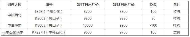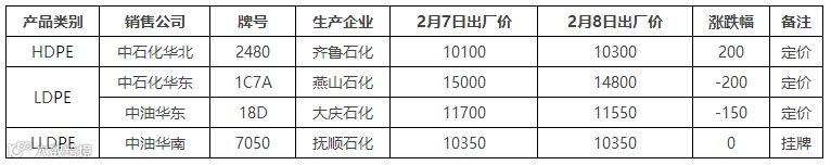 表4 2月8日国内PE出厂价格调整(单位:元/吨)