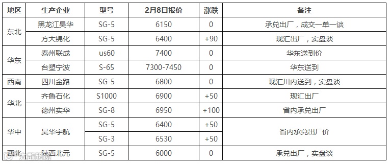 表6 2月8日国内PVC出厂价格调整(单位:元/吨)
