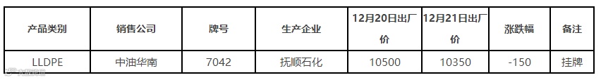 表4 12月21日国内PE出厂价格调整(单位:元/吨)