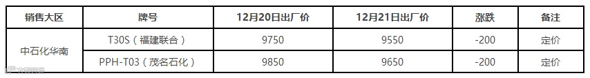 表5 12月21日国内PP出厂价格调整(单位:元/吨)