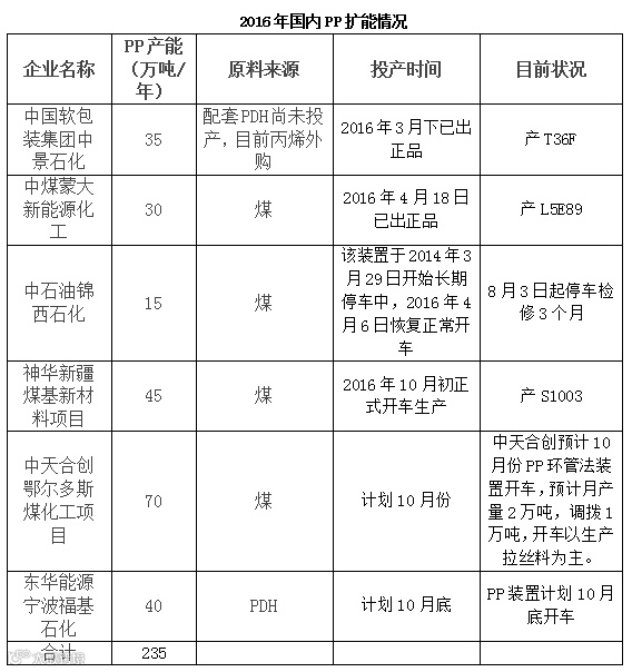 大幅扩能成为PP空头最大的武器,而新投产也成为一次又一次的行情毒药。2016年年初PP市场预期扩能逾300万吨,但截止目前国内新投产PP产能在125万吨。年内投产计划来看,宁波福基计划10月底开车,中天合创计划11月份开车,其他如富德常州、久泰能源、青海盐湖、华亭中熙等均推迟至2017年。