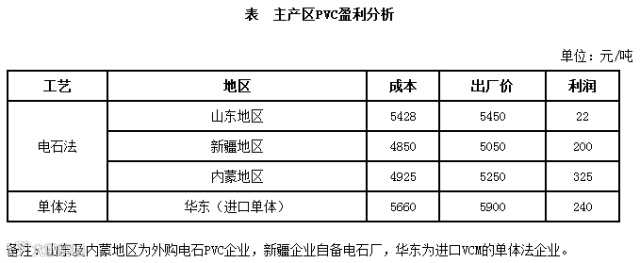由于在期货提振下,PVC企业出厂价维持了高价,而原料电石价格维持低位徘徊等因素影响,PVC企业盈利表现尚可,由下表可见,无论是电石法企业还是乙烯法企业均已经实现了盈利。