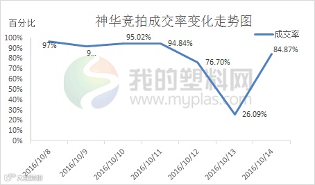 上半月国内神华系列竞拍平均成交率在81%,其中成交率峰值出现在国庆假期归来第一个交易日,成交率高达97%。原因是由于假期归来,多数下游工厂集中入市补仓。同时国际油价稳步上移,石化集体拉涨,部分贸易商入市采购。刚需及投机性需求集中入市,市场买气明显转暖。谷值出现在10月13日,成交率在26.09%,主因PP期货大幅下挫打压市场买气。