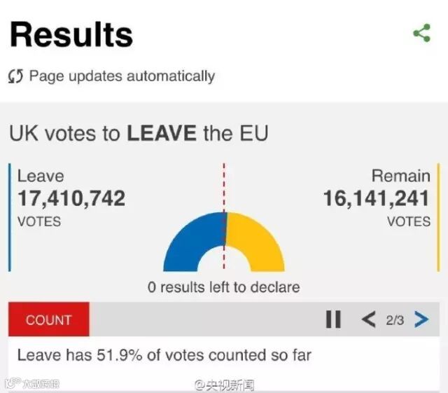 英国公投382个投票区计票最终结果显示,51.9%的民众选择支持脱离欧盟。英国“脱欧”重创英国金融市场,今天英镑暴跌超,创30年来新低。另外,欧美股市前景暗淡,亚洲股市也应声下跌。此外,有媒体猜测持“留欧”立场的英国首相卡梅伦可能因此辞职。