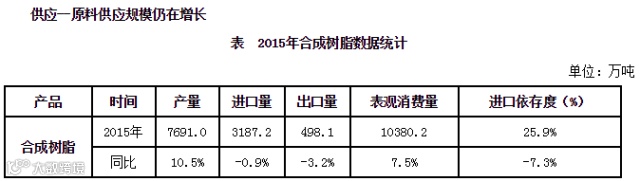截至2016年4月份国家数据显示,合成树脂累计产量2639.9万吨,同比增长9.8%。可以看出塑料原料供应量依然保持有效增长。