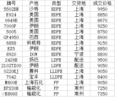 今日PE市场价格小幅走软,华东和华南部分线性跌50-100元/吨,华北和华南部分低压走软50-200元/吨,高压变动不大。线性期货低开弱势震荡,且部分石化下调出厂价,商家心态悲观,随行跟跌出货。下游工厂补仓积极性不高,按需采购居多,实盘成交难有放量。华北地区LLDPE价格在8450-8700元/吨,华东地区LLDPE价格在8500-9000元/吨,华南地区LLDPE价格在8800-8900元/吨。