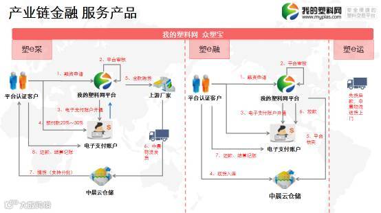 新三板塑料电商第一股,中晨电商开展的基于信息化的塑料产业供应链金融,是以我的塑料网注册商户为核心用户,包含上游供应商、下游经销商、我的塑料网交易用户在内的供应链各环节为服务对象;以仓单质押、委托采购及信用销售风险控制等整体解决方案为服务方式;开发满足核心企业需求的金融服务产品,为企业、贸易商解决现金流并提供信用销售整体风险控制服务。