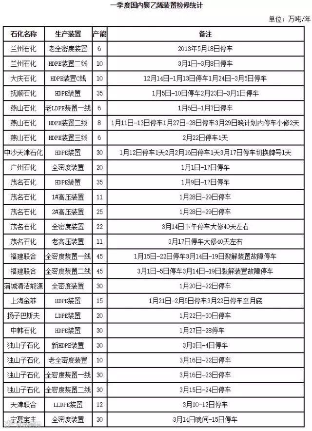 2016年一季度聚乙烯生产企业暂无新成员加入,供应量总体呈现稳中上行走势。一季度我国PE供应产能维持在1528.8万吨,一季度产量为364.15万吨,同比增长7.32%。损失量方面,据卓创统计一季度PE检修损失产量22.59万吨,同比2015年同期减少9.91万吨。具体装置检修情况汇总如下表: