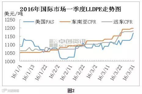 的进行,也使得市场供大于求的状况得到改善,国际PE价格一路上涨。卓创跟踪显示,截至3月底,国际PE价格仍是稳中上涨,LLDPE远东CFR维持1182.5美元/吨。