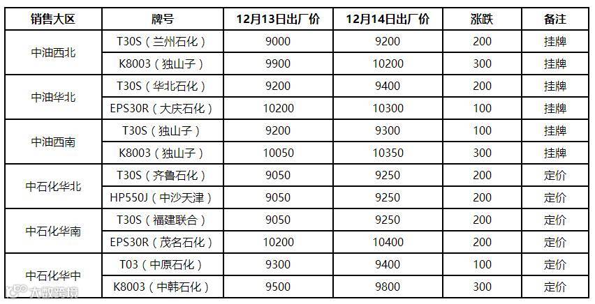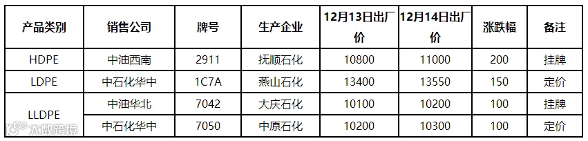 表4 12月14日国内PE出厂价格调整(单位:元/吨)