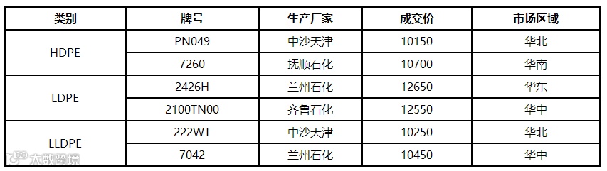 表1 12月14日我的塑料网PE市场成交价格(单位:元/吨)