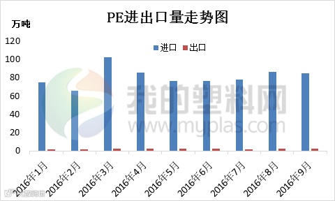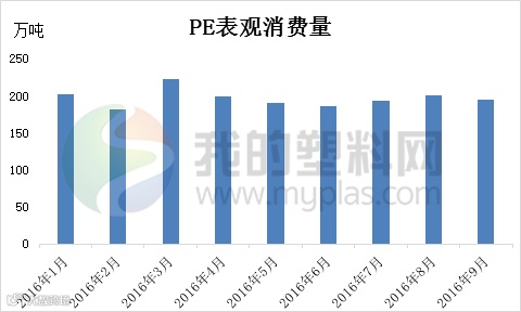 2016年至今表观消费量数据呈现波浪式运行,临近两月基本环比都是一涨一跌。其中9月份PE表观消费量在195.11万吨,环比在-3.06%,同比上涨2.48%,消费量缩小是阻碍行情良性运行的主要因素。