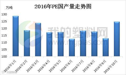 据我的塑料网统计,2016年PE产能目前已达到1585.8万吨,较去年同期增长6.87%。进入四季度以来,PE月度国产量基本维持在119万吨左右,较往年同期增长7.21%,产量增多的原因主要由于煤化工装置相继投产,并且产品顺利面市,市场聚乙烯原料流动量加大,供应逐渐增多。目前已经投产的煤化工装置有陕西延长60万吨/年,中煤榆林、宁夏宝丰、蒲城清洁能源、神华榆林及中煤蒙大等分别在30万吨/年的产能,未来仍有久泰能源及山西大同煤矿集团等企业陆续投产,届时PE产量将进一步扩大。