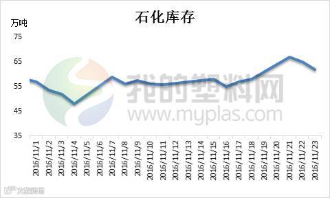 由图中可以看出,2016年11月国内石化库存整体处于较低水平,目前大庆石化、兰州石化及福建联合等部分装置仍处于停车中、检修中。据不完全统计,11月份石化检修共计损失5.02万吨左右。目前终端需求延续迟缓,商家出货速度缓慢,石化库存呈现小涨趋势。