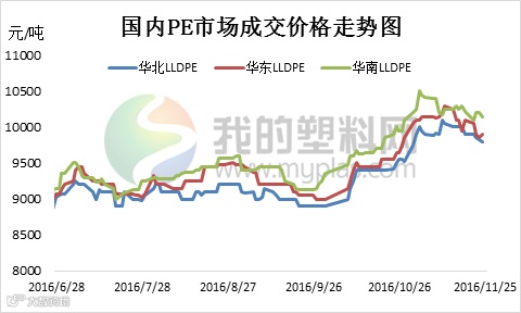 如图看出,国内PE市场进入下半年后,第三季度价格呈现弱势整理走势,10月开始大幅上涨,11月开始下滑。回顾过去的三季度行情,虽处在行业的旺季,但价格走势却差强人意,价格一直维持弱势。进入9月以后聚乙烯市场总体表现承压回落走势。线性期货价格震荡下移,现货市场高价出货遇阻,石化多数下调出厂价格,现货市场应声回落。10月假期归来后,因合成树脂库存减少,石化频繁上调出厂价,市场成本支撑较强。市场货源紧缺,尤其是石化前沿库出现缺货现象,部分存有现货的商家纷纷跟涨出货。虽然期初下游对高价原料存有抵触情绪,石化低库存及期货连续高开支撑,使得各品种价格不断走高。11月随着塑料期货暴跌,重挫市场交投气氛,聚乙烯现货市场下滑明显。