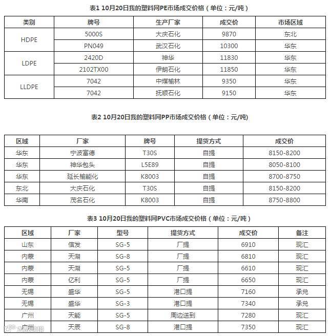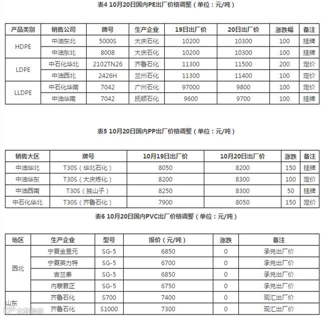 今日国内PE/PP市场小幅上涨,PVC盘整为主。PE石化小幅调涨部分牌号出厂价,现货市场表现持稳,少数市场活跃度略有提高,终端刚需采购为主。PP中油大区出厂价格上调,货源成本支撑作用进一步加强,然PP期货震荡穿刺,整体重心下移,一定程度打压市场买气。PVC市场报价平稳,场内询盘氛围低迷,商家保持观望心态,成交刚需。