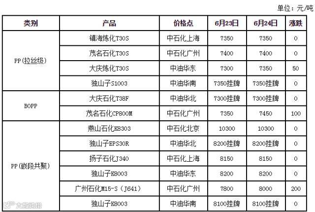 今日PP出厂价格一览表