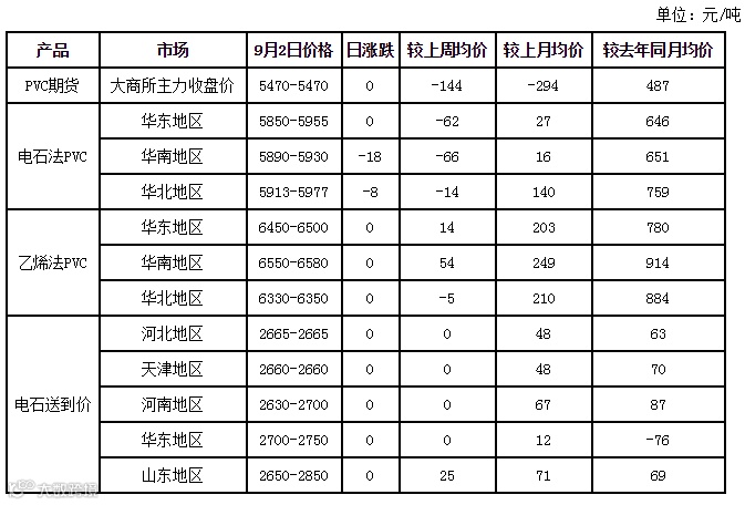今日PVC生产企业接单不佳,但西北企业前期订单仍然较多,销售压力暂时不大,出厂价稳定,中东部部分小厂出厂价小幅回落。5型普通电石料内蒙企业主流承兑出厂报价5700-5750元/吨;山东地区主流承兑出厂5920-6030元/吨;河北地区主流出厂在5900-6050元/吨承兑;山西地区主流出厂5850-5900元/吨承兑。华东地区乙烯法企业6450-6550元/吨送到,库存偏低,报价高挺。