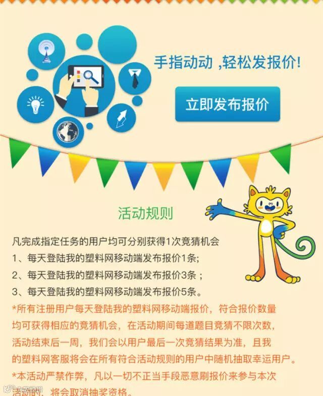 1、每天登陆我的塑料网移动端发布报价1条(完成后系统自动弹出一个里约奥运问题,答对后即可获得奖励)