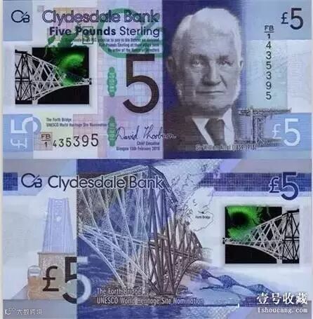 等国家和地区都已经使用塑料钞票,英国苏格兰克莱兹代尔银行也于2015年3月宣布发行英国首批塑料币(见下图),英国其他地区将从2016年起发行5英镑面额的塑料钞票。