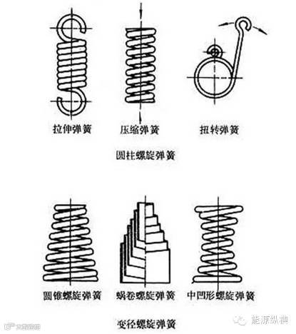 按形状可分为:螺旋弹簧、碟形弹簧、环形弹簧、波形弹簧、板弹簧、截锥涡卷弹簧、发条弹簧(卷弹簧)、扭杆弹簧、地弹簧、卡簧、异型弹簧…等。