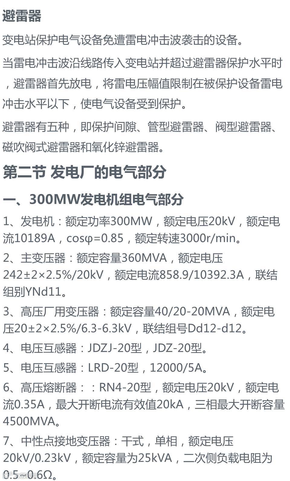 介绍完了锅炉和汽轮机部分,接下来该介绍电站的电气部分了,怎奈这部分内容详细所谓,全部介绍下来近千页图片,今天先送上比较独立的一部分发电、变电和输电部分。