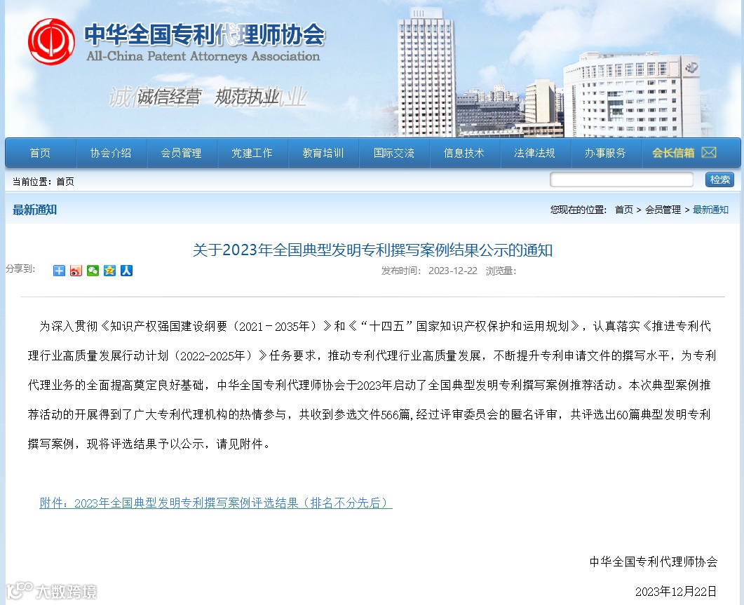 近日,中华全国专利代理协会公示2023年全国典型发明专利撰写案例结果,由我司专利代理师桂婷代理撰写的一项发明专利案例成功入选。