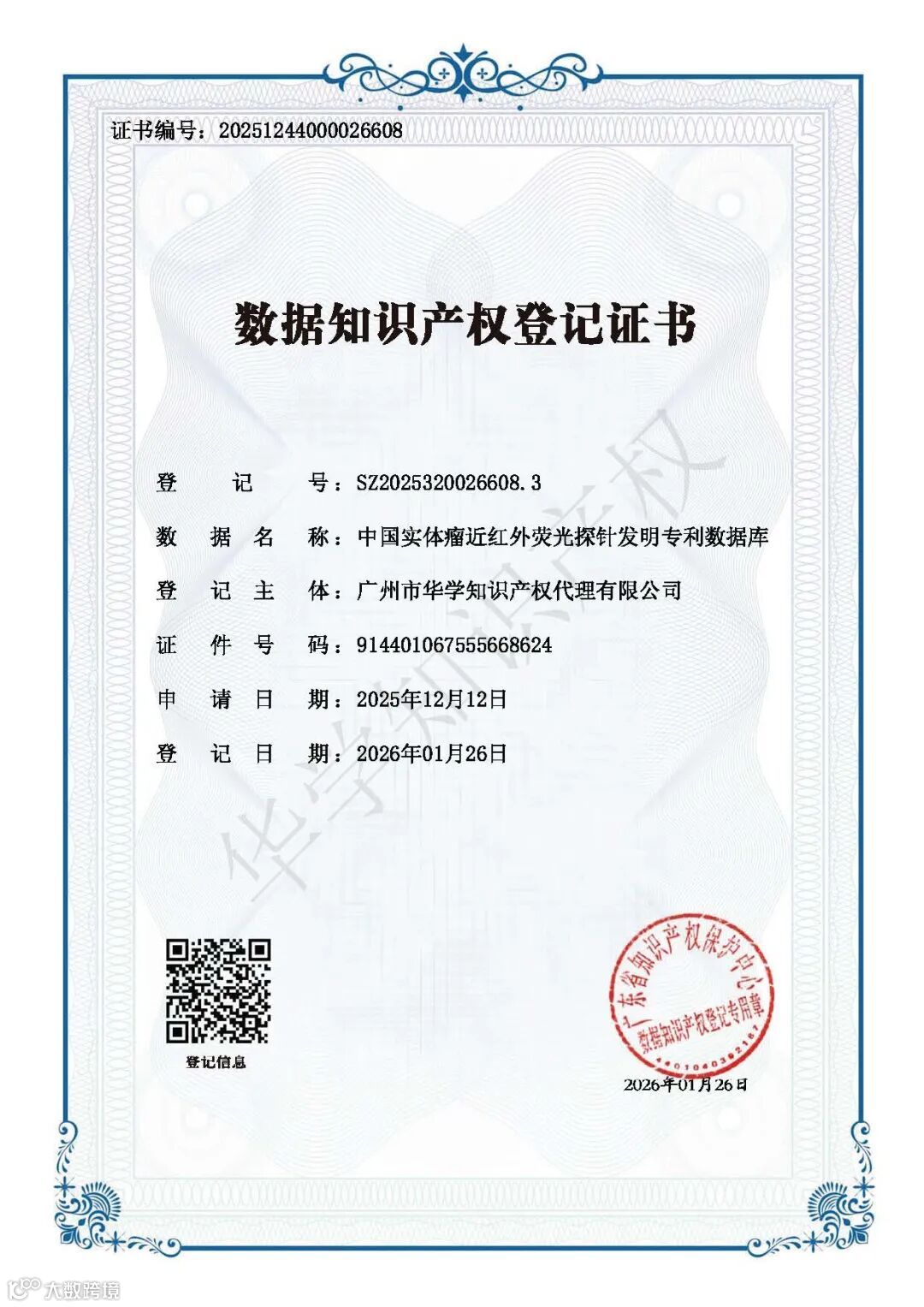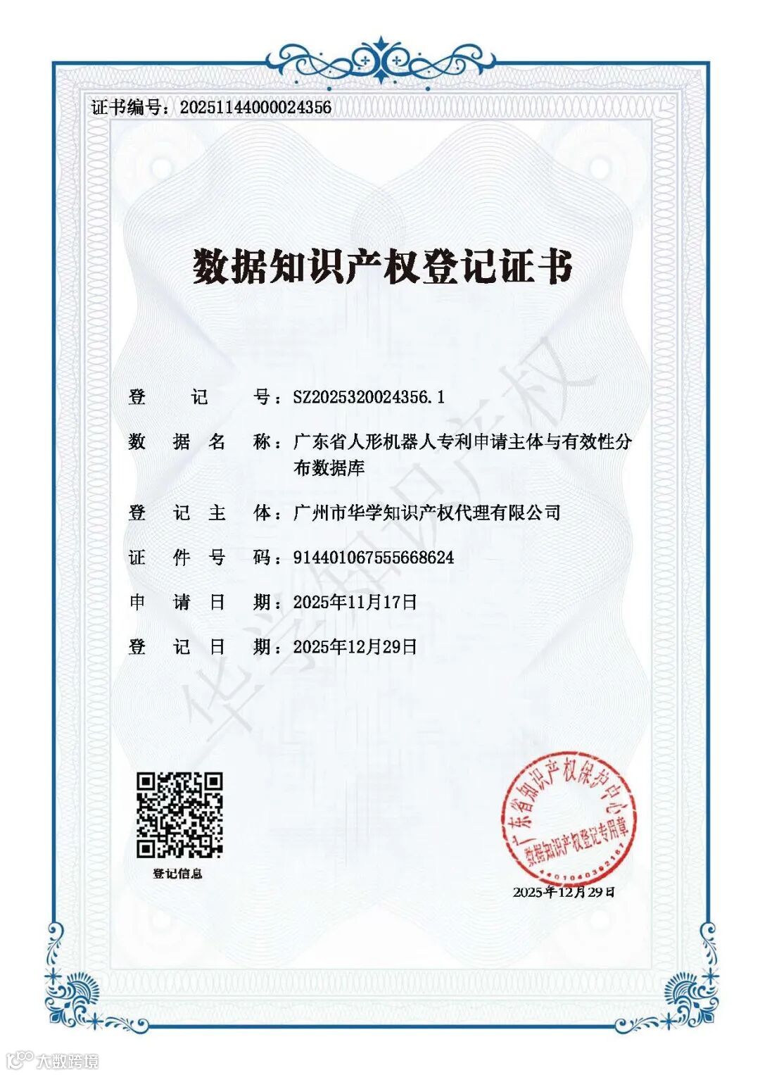 基于专业的数据处理与情报分析能力,华学知识产权成功获得 “广东省人形机器人专利申请主体与有效性分布数据库”与“中国实体瘤近红外荧光探针发明专利数据库”两项数据知识产权登记证书。此次登记,是华学知识产权将多年积累的知识产权专业能力系统延伸至数据资产领域的重要体现,进一步夯实了公司在知识产权全链条服务中的综合能力。