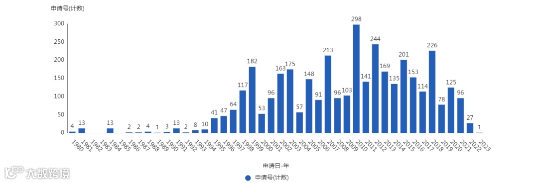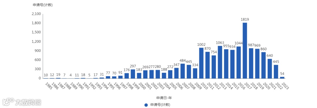 图1 戴森公司专利申请趋势图(1985-2023)