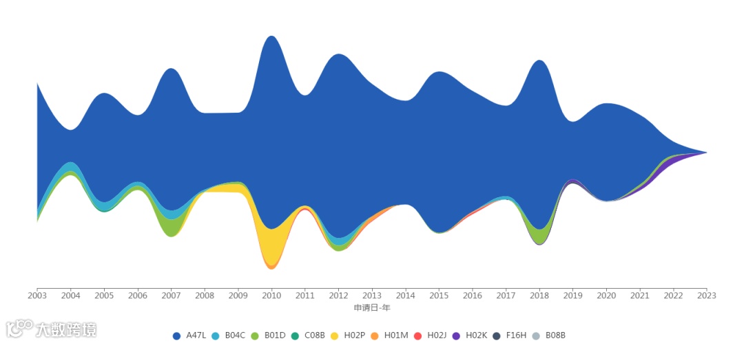 图4是分析对象在不同技术方向专利申请量的分布情况和发展趋势。分析各阶段的技术分布情况,有助于了解戴森在特定时期的重要技术分布,挖掘戴森近期的热门技术方向和未来的发展动向,有助于对戴森研发方向有一个整体认识,并对研发重点和研发路线进行适应性的调整。对比各技术方向的发展趋势,有助于识别哪些技术发展更早、更快、更强。从图5可知,戴森公司这么多年的专利申请主要集中在A47L的技术领域中,其专利主要集中于吸尘器的配件改进,如吸尘器清洁头等设备,吸尘器是戴森的主要产品,其在2015年之前专利申请主要集中在吸尘器清洁头设备研发上,在2010年除了A47L的专利申请,其在H02P的技术领域也申请较多的专利,主要是电机的研发,而其他领域的申请量较少。