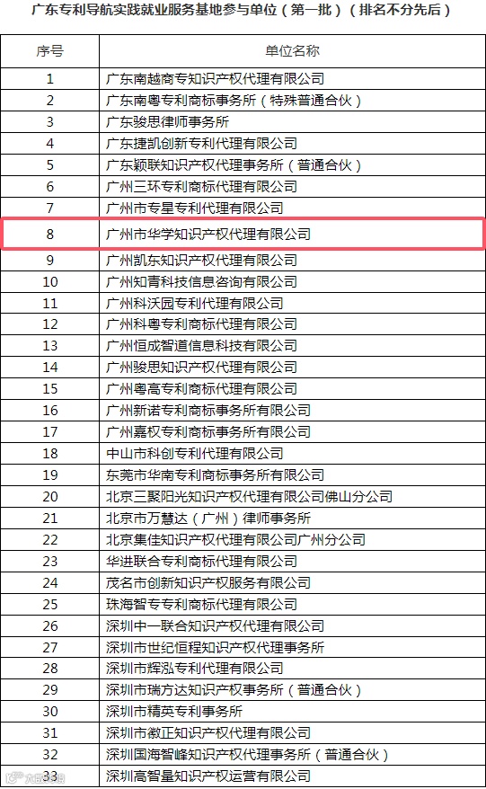 近日,广东专利代理协会公布了首批广东专利导航实践就业服务基地参与单位、专利导航专家讲师及技能实践导师库的名单,共33家机构荣获“首批广东专利导航实践就业服务基地”称号。经过公开征集、严格的资格初审及理事会审核,华学脱颖而出,成功入选基地名单。同时,公司两位专家——合伙人裘晖及项目管理部副总经理梁婉玲,凭借其深厚的专利导航理论素养和丰富的实战经验,成功入选广东专利导航实践就业服务基地专利导航专家讲师及技能实践导师行列。此次入选,不仅是对华学在知识产权服务领域专业实力的认可,也是对公司及其成员在推动行业发展方面所做努力的高度肯定。
