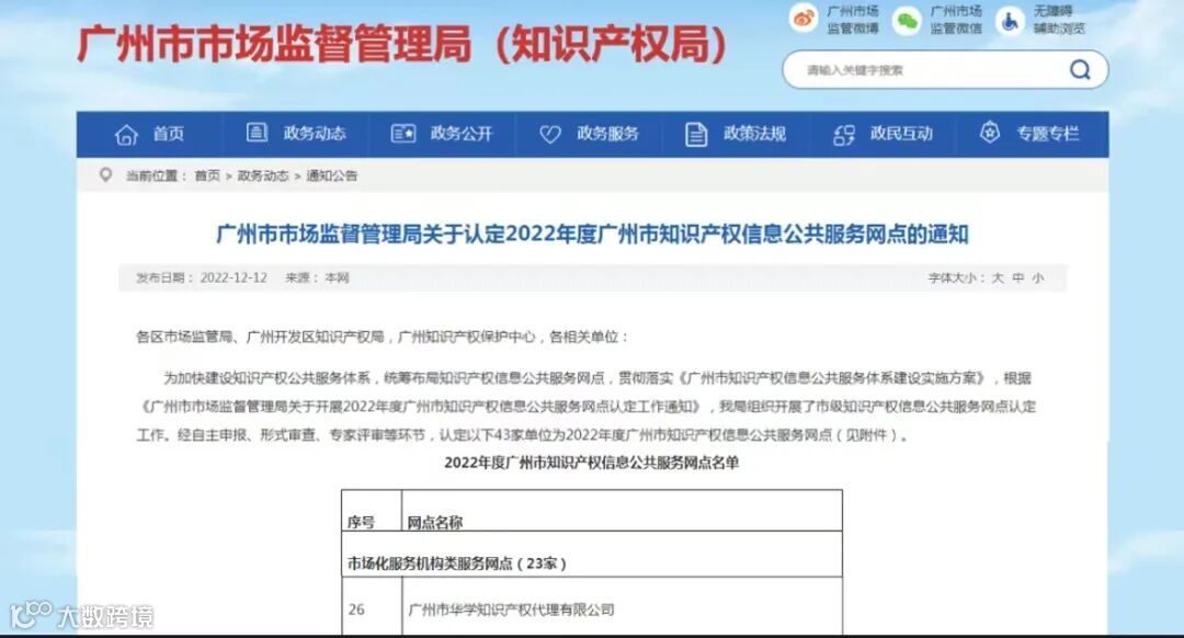 2022年12月12日,广州市市场监督管理局(知识产权局)发布《广州市市场监督管理局关于开展2022年度广州市知识产权信息公共服务网点认定工作通知》,华学成功入选并认定成为市场化服务机构类服务网点!